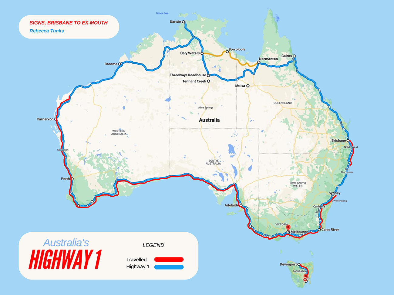 This work forms part of a larger, ongoing series mapping Australia’s Highway 1 — the world’s longest national highway. Spanning over 14,500 kilometres, Highway 1 forms a loop around the country, connecting almost every capital city and major regional centre. It offers a unique cross-section of Australian life, moving through remote landscapes, coastal towns, and metropolitan centres.